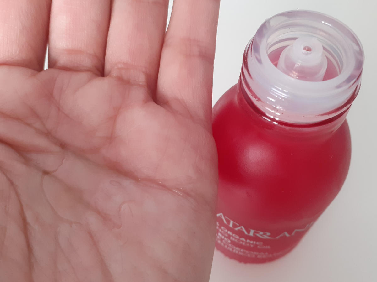 Y el frasco es minimalista y bonito, tanto que lo he dejado a la vista porque me transmite tranquilidad ese color rojo que tiene. Es translúcido con lo que se ve perfectamente cuánto aceite queda en su interior. De plástico sólo tiene el adaptador, que viene perfecto para controlar la cantidad y para que no salga producto por fuera. Por último, tenemos el tapón de ¿aluminio? que se me ha pasado de rosca con lo que tengo que estar pendiente de dejarlo siempre lo más cerrado posible.
